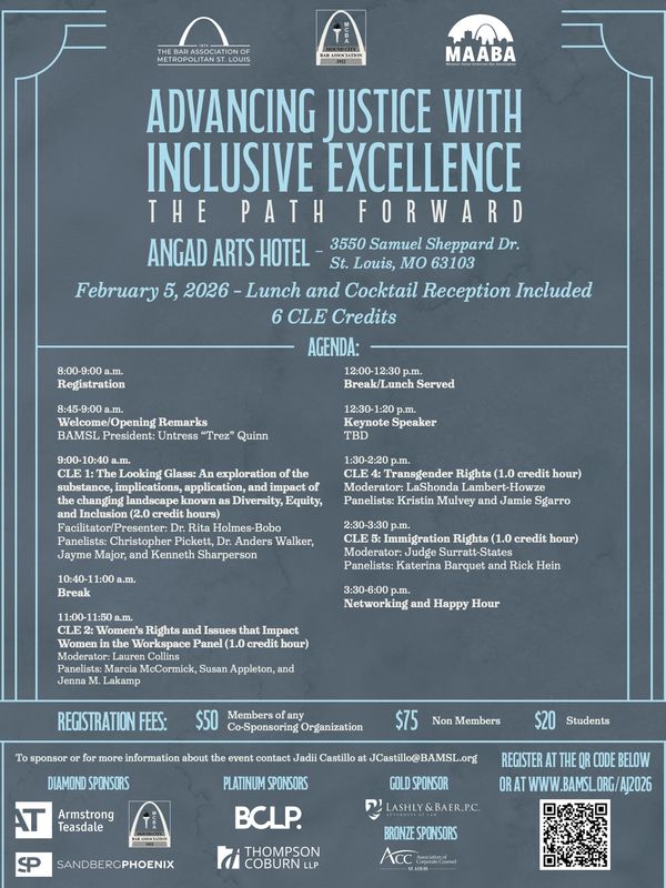 Join MAABA, Mound City Bar Association, and BAMSL for a joint CLE on Thursday, February 5th. The program is approved for 6 hours of CLE credit. MAABA members in good standing are entitled to register at the $50 member rate. Lunch is provided and a cocktail reception will follow.